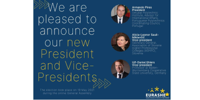 Professor Armando Pires eleito Presidente da EURASHEFoi ontem eleito para a European Association of Institutions in Higher Education (EURASHE) o Professor Armando Pires, vice-presidente do CCISP entre 2013 e 2014, sucedendo, deste modo, ao francês Professor Stéphane Lauwick. Ler mais >